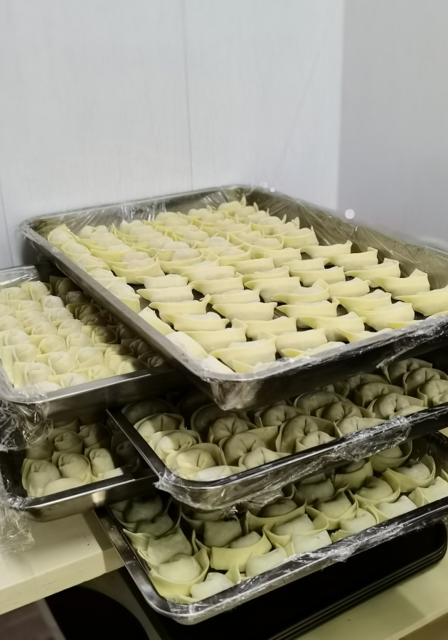 食堂里,師傅們早已準(zhǔn)備好了餡料和餛飩皮,就等著包餛飩能手們大展身手。將餛飩皮攤在手心,舀上餡料,一折一捏,一個(gè)美觀飽滿的餛飩就包好了。在大家的巧手下,滿滿幾大盆的餡料很快見底,取而代之的是一盤盤美味可口的餛飩。
