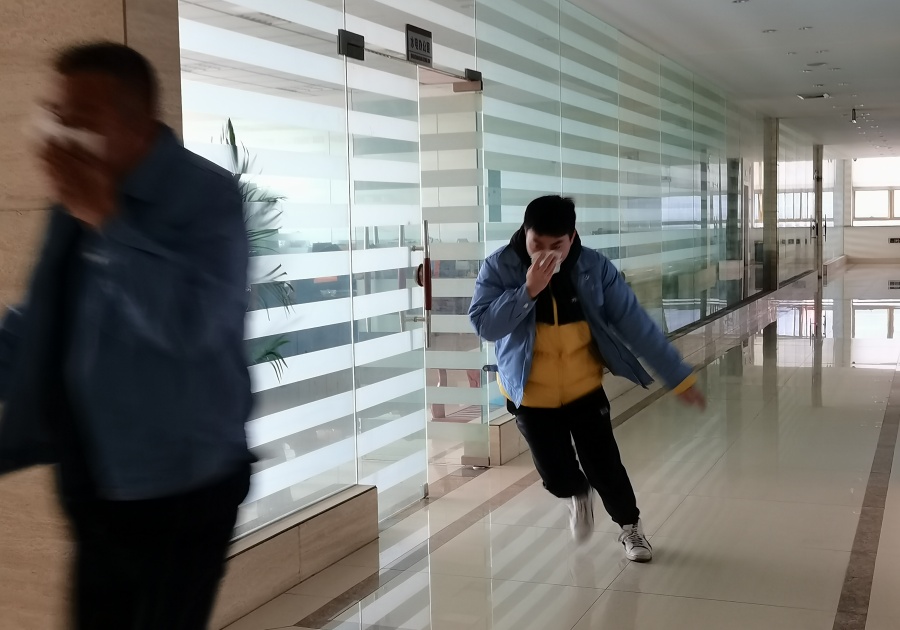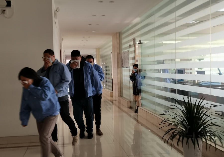 項目一:辦公樓疏散演習。總指揮一聲令下,全體員工立即捂住口鼻,俯下身姿沿安全樓梯有序疏散。