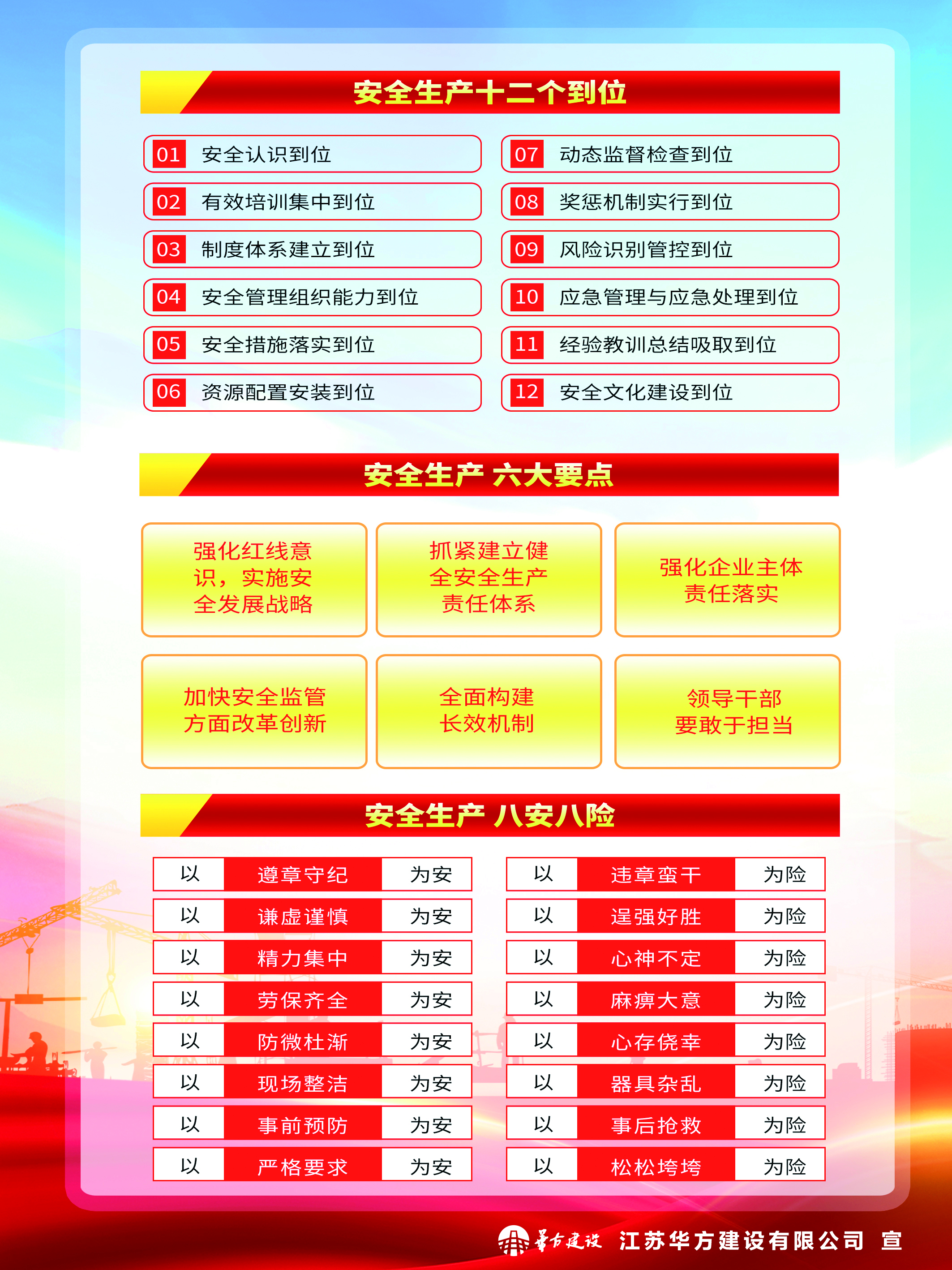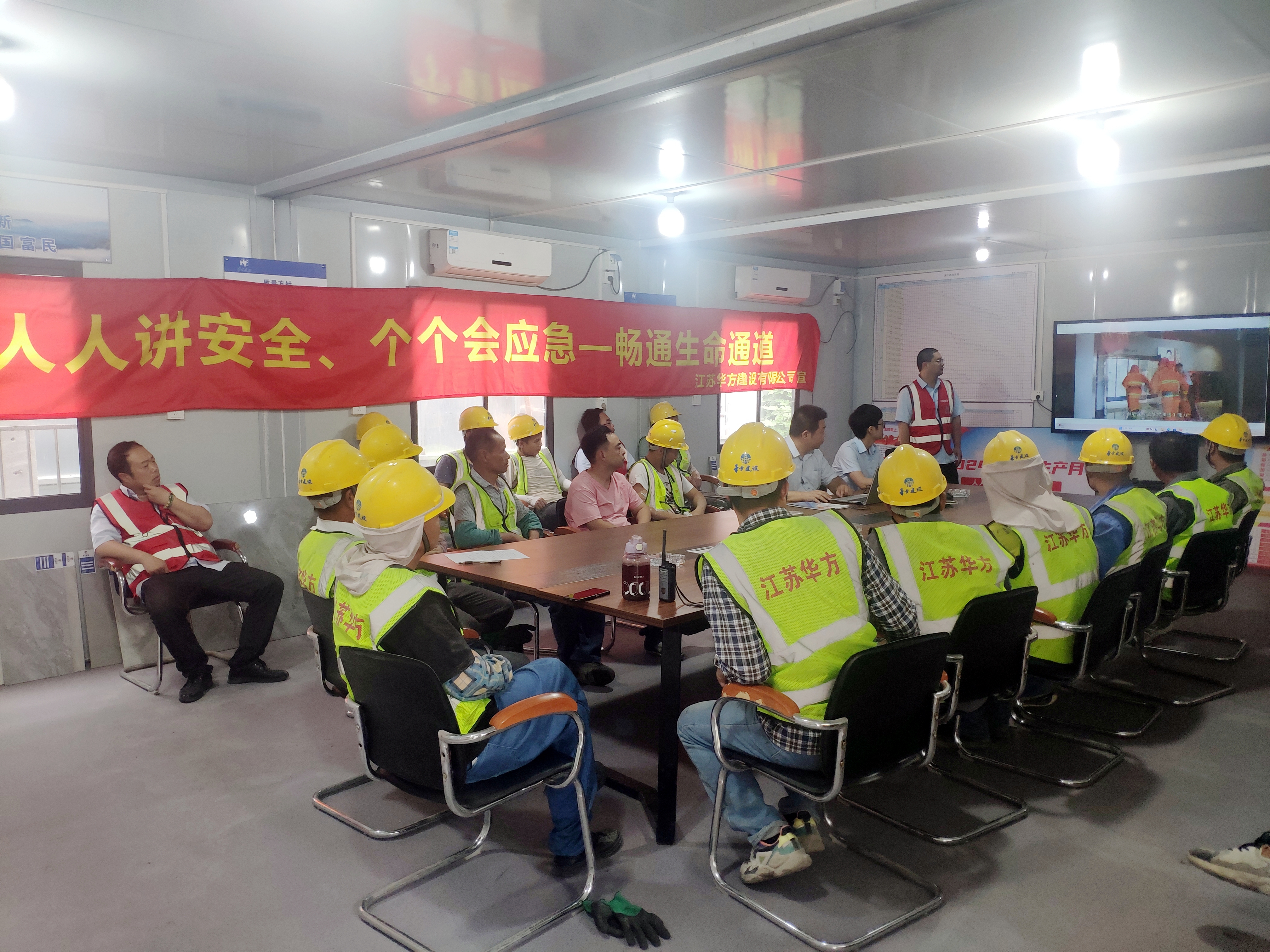 華方建設通過在各項目懸掛安全橫幅、宣傳展板等多種形式,讓大家牢固樹立安全防范意識和提升自我保護能力。項目上的智能化安全設備,也有效擴大了安全管理覆蓋面,降低了安全風險系數。
